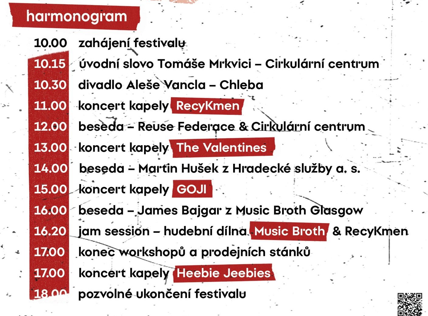 Navazující předfestivalový týden otevřel dílny Cirkulárního centra veřejnosti – lidé společně vyráběli dekorace, učili se upcyklaci a zakončili týden koncertem kapely RecyKmen.