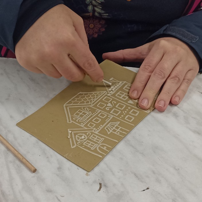 Aktivita: nakreslení nebo přenesení návrhu, práce s rydly, vyrytí vzoru,