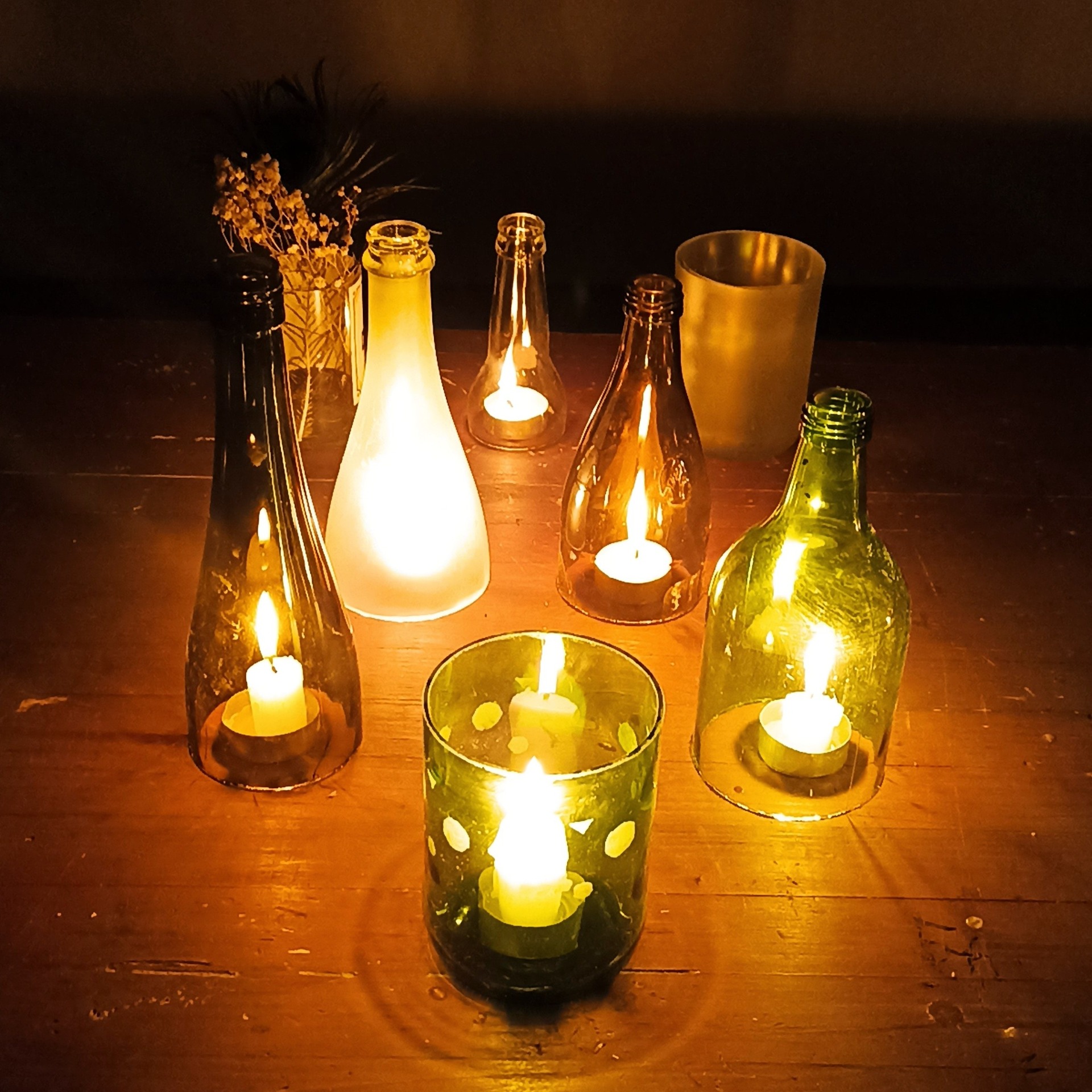 Materiál: skleněné lahve od nápojů a zavařenin, voda, zdroj tepla (svíčka)