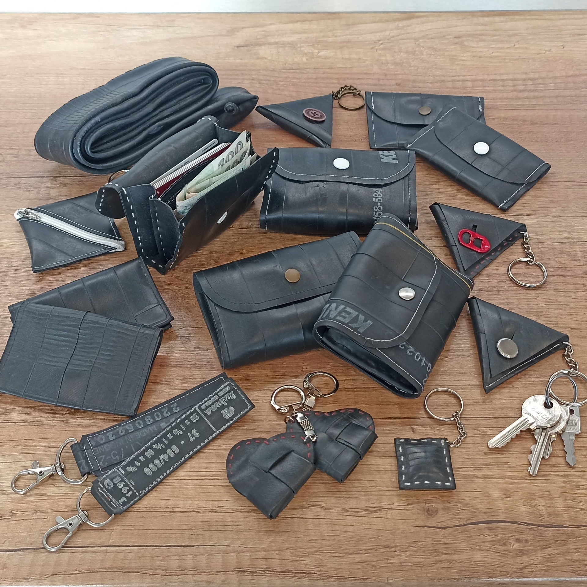 Materiál: duše z jízdního kola, bavlnky, knoflíky, patenty, kovové kroužky