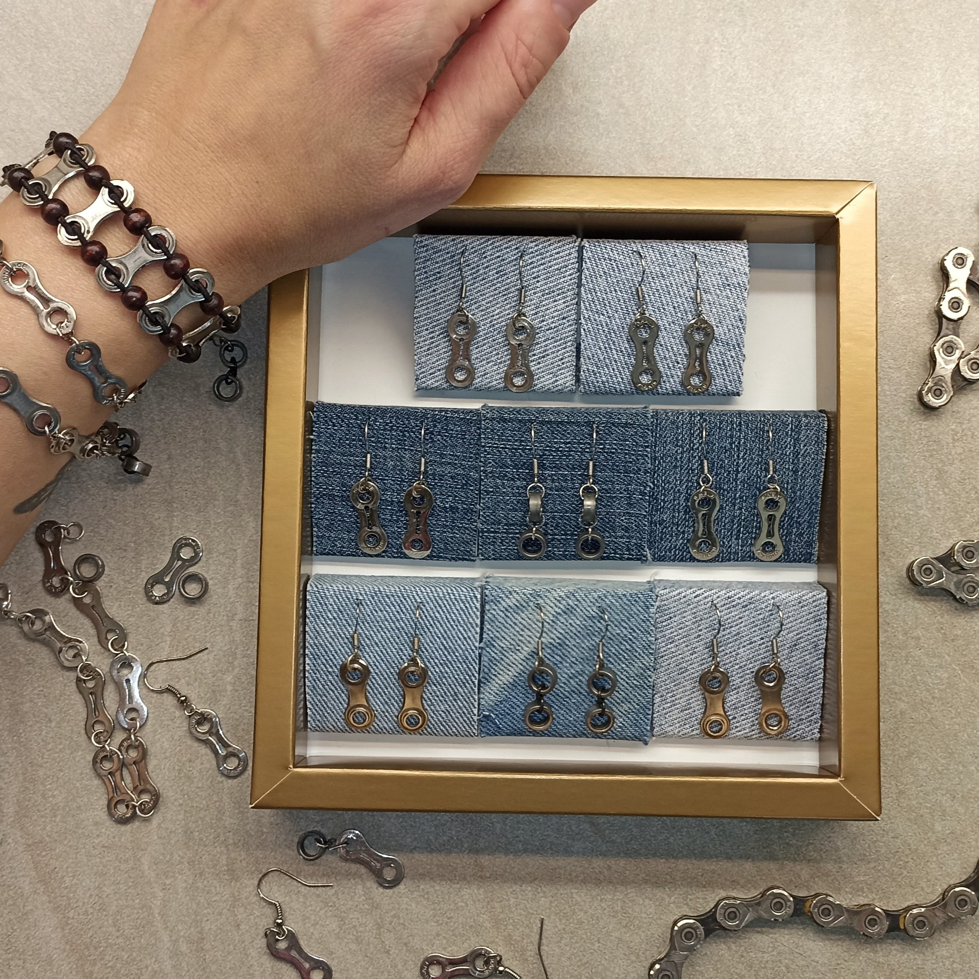 Materiál: řetězy a součástky jízdních kol, šperky, odřezky kůže, bižuterní