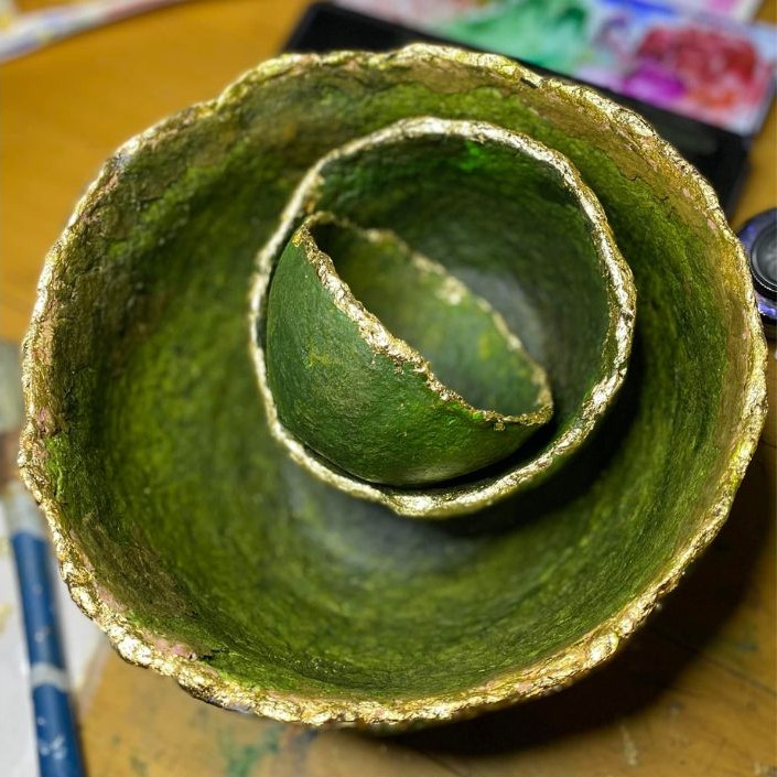 Materiál: potištěné papíry, noviny, letáky, voda, lepidlo/škrob, forma nebo