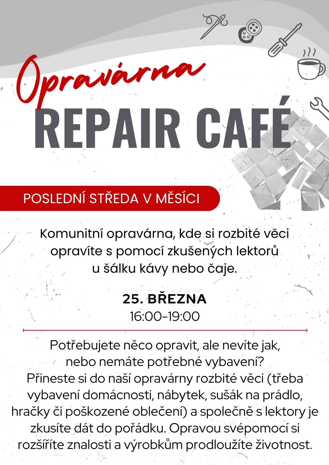 Pravidelně v pondělí a ve čtvrtek se scházíme při kreativních dílnách. Vyzkoušíte si různé techniky upcyklace, tedy znovuvyužití již nepotřebného materiálu a jeho zpracování. Při práci si osvojíte nové dovednosti, pracovní postupy, dozvíte se něco o historii a budoucnosti materiálů a cirkulární ekonomice. Zážitky a své výrobky si pak odnesete domů. 🙂